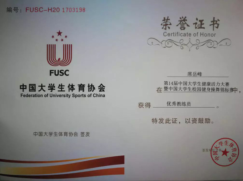 健美操世界冠军、国际健将、我校体育投注 教师席岳峰获得了优秀教练员荣誉称号。