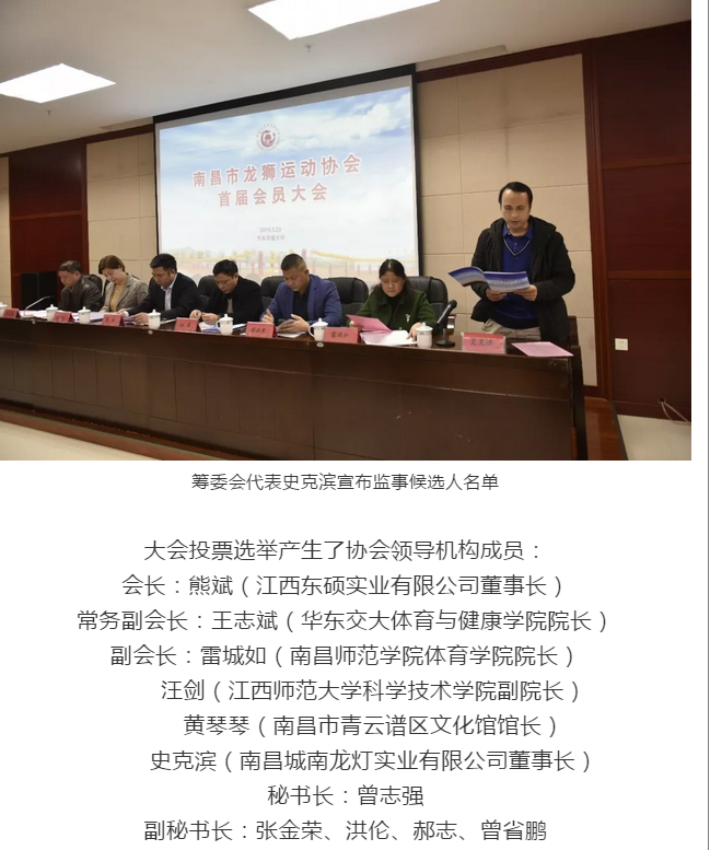 2019年3月23日,南昌市龙狮运动协会首届会员大会在我校举行,南昌市体育总会秘书长伍革,南昌市民政局程洪亮主任出席了会议,体育投注 院长王志斌主持会议。