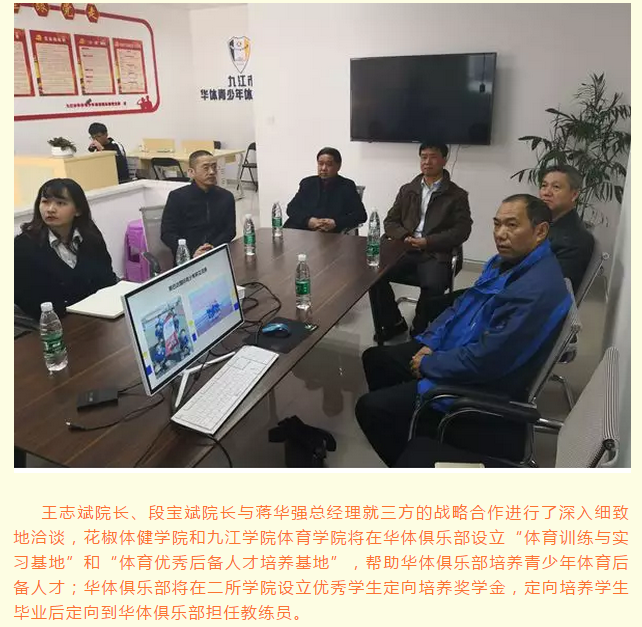 和九江学院体育学院将在华体俱乐部设立“体育训练与实习基地”和“体育优秀后备人才培养基地”,帮助华体俱乐部培养青少年体育后备人才;华体俱乐部将在二所学院设立优秀学生定向培养奖学金,定向培养学生毕业后定向到华体俱乐部担任教练员。