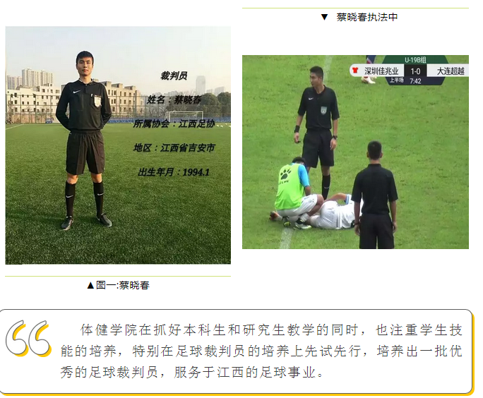 足球裁判员遍布全省各地,部分优秀的裁判员已经活跃在中国足球职业联赛的赛场上,15级体育研究生(原体院11级体教学生)杨磊同学执法中国足球协会乙级联赛;99级体教学生陈国华、00级体教学生李旻、谢俊、李峰担任江西省足协裁判长工作。体育投注